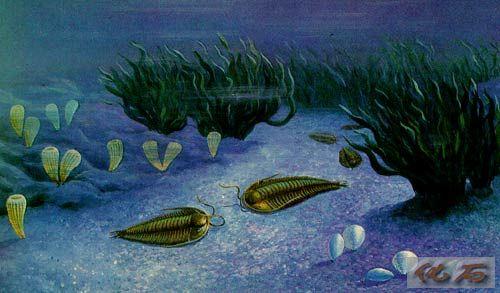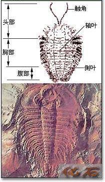 三叶虫的虫体外壳纵分为一个中轴和两个侧叶,故名三叶虫,由前至后又横分为头、胸、尾3部。三叶虫全属海生 ,多数营游移底栖生活 ,少数钻入泥沙中或漂游生活。寒武纪早期出现,种属和数量都很多,到了晚寒武世发展到高峰,奥陶纪仍然很繁盛,进入志留纪后开始衰退,至二叠纪末则完全绝灭。