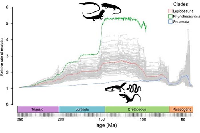 埃雷拉·弗洛雷斯博士说,鳞龙类起源于2.5亿年前的中生代早期,它们分化成有鳞类和喙头类。他们发现,在有鳞类前三分之二的进化史中,演化速率缓慢;而其姐妹演化分支喙头类,虽然如今只由一个物种组成,却显示出曾有过快速的演化速率。