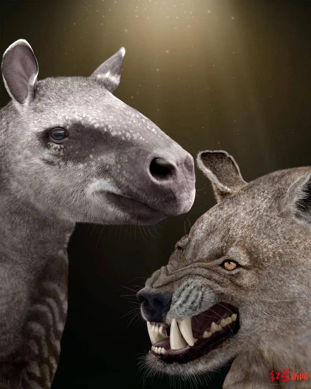 大型食草动物如鬣狗(左)和大型食肉动物如弓形兽(右)在恐龙死亡后进化而来