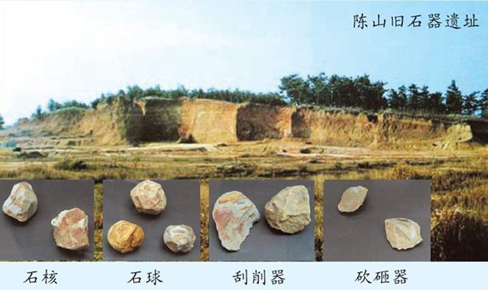 陈山遗址中的石器,主要是石英砂岩与石英岩砾石加工的工具,大致可分为四类:一是砍砸器类。二是尖状器类。三是刮削器类。四是石球与石核类。