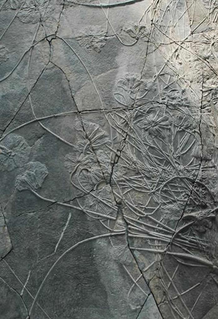 经过修复和拼接,可以清晰地看到:化石表面呈现的扇形冠状海百合,一般冠径10至40厘米,茎可至l60厘米以上,茎杆直径1厘米左右。也有个别为2.5厘米,根部不太发育,因此不甚明显。