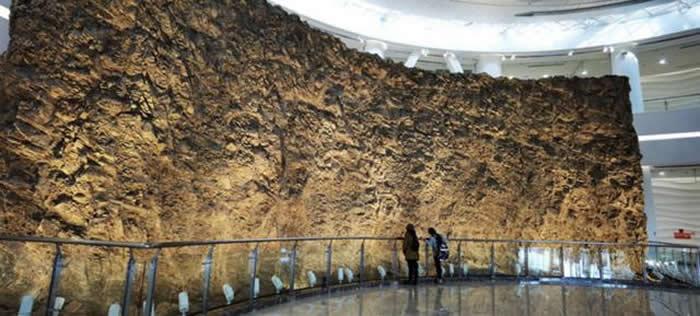 步入澄江化石地自然博物馆一楼大厅,最先被“镇住”的是一堵巨大的化石墙。它既是展品,又是埋藏澄江化石的真实地层,被誉为“无字天书”。