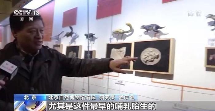 北京自然博物馆馆长 研究员 孟庆金:这里展出的都是我们近几年最新的研究成果,迄今为止已知最早会滑翔的哺乳动物,最早在地下打洞的哺乳动物,最早在树上生活的哺乳动物,尤其是这件最早的哺乳胎生的,目前发现在侏罗纪,我们取名为中华侏罗兽。