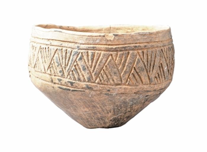 藏品年代为距今约3120—3310年(商代晚期)。该钵为大庆市肇源县白金宝遗址二期遗存,夹砂黄褐陶,敛口,尖唇,弧折腹。口沿有慢轮修整的痕迹,上腹部饰内填平行线的交错三角篦纹。口径14厘米,底径4.2厘米,通高11厘米,重480克。该器物保存完整,十分难得。