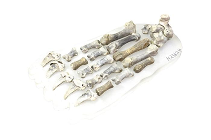 棕熊右前足化石年代为晚更新世晚期,出土地点为大庆市大同区太阳升镇马家窑屯。该化石为一只完整的棕熊右前足化石,包括腕骨、掌骨、指节骨等,保存十分完整。