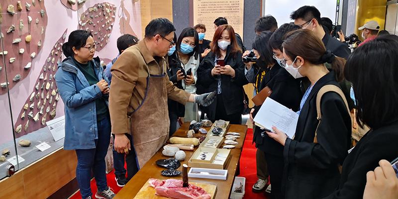 在开幕式致辞结束后,各位专家和媒体嘉宾移步到人类演化馆,吴秀杰研究员现场讲解了人类演化历程和中国发现的有代表性的古人类化石,张晓凌研究员讲解了“荒野求生”展区的石器展品和石器研究对人类的意义以及“艺术曙光”展区的国内外发现的艺术装饰品,张明博士后讲解了“遗传密码”展区,详细地介绍了科学家们通过古DNA研究解开古人体里的遗传密码,使人类追溯历史,在一个更为宏大的背景下探究人群之间的相互关系。王原馆长对人类演化馆的“科学面对面”展区做了系统地介绍,介绍了“科学之树”的构成,解释了科学精神、科学思想、科学方法、科学知识之间的关系。