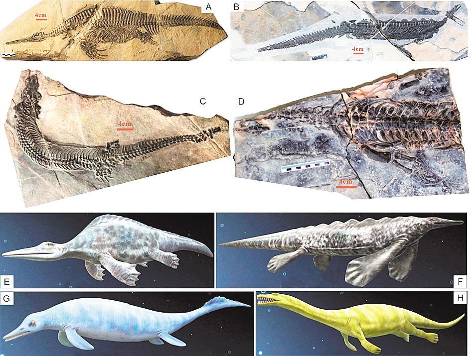 落星村发现的不同海生爬行动物化石及复原图。 (通讯员 程龙 摄)