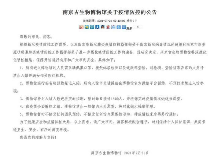 (化石网整理)据现代快报(记者 阿里亚):7月21日上午,南京古生物博物馆发布公告称,根据新冠疫情防控工作需要,该博物馆将深度优化管控措施,保障博物馆运行有序和广大市民安全。