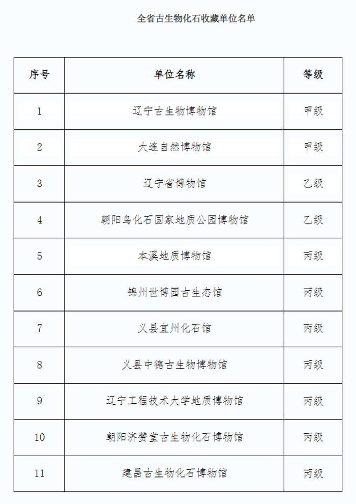 (化石网整理)据辽宁省自然资源厅(矿产资源保护监督处):依据《古生物化石保护条例》(国务院令第580号)、《古生物化石保护条例实施办法》(国土资源部令第57号)及有关规定,经辽宁省自然资源厅检查评估和辽宁省古生物化石专家委员会评定,辽宁省古生物博物馆等11家收藏单位为辽宁省古生物化石收藏单位,现予以公告。