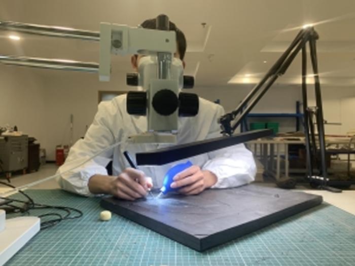 此刻,他端坐在修复台前,手握气动笔,专注地通过显微镜小心翼翼清理化石围岩。这是一项极为精细的工作,修复师必须全神贯注,通过显微镜掌握工作进度。化石修复需要专注和耐心,在修复室静坐十几个小时,是修复师的工作常态。