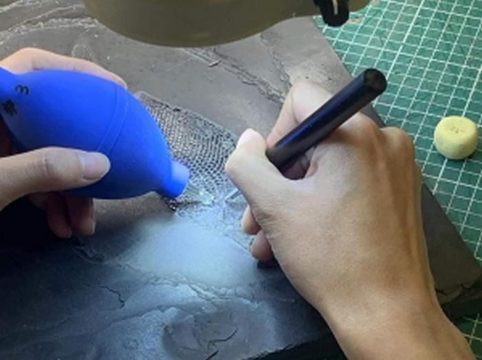对很多人来说,化石修复是一件异常枯燥的工作。李周强在刚开始接触化石修复时,常常几个小时都下不了“笔”,第一块化石(直径约25厘米)就修复了足足一个月。“我刚开始学习化石修复的时候,是从简单的三叶虫化石开始练手的。初期主要练习使用手动工具,学习感受修复的深浅,熟悉力度。”李周强告诉记者。