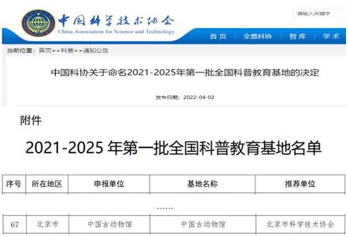 中国古动物馆入选全国科普教育基地2021—2025年第一批认定名单
