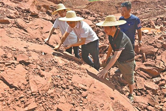 河源文物考古工作者在野外保护和抢救性发掘恐龙蛋化石资源。