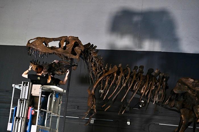 展览安装团队正将暴龙头骨安装于骨架上。香港科学馆供图