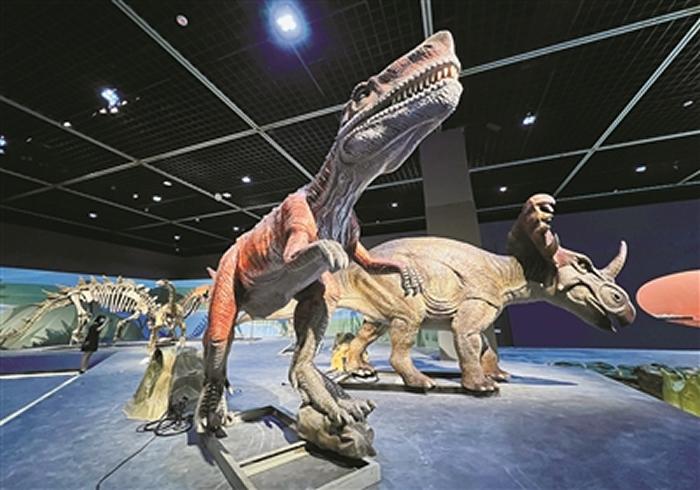 在展厅设置的大型骨架模型和雕塑展区,观众可以近距离认识这些恐龙家族的成员。这些大型骨架和雕塑运用科技手段,使之能晃动身体或发出声音,非常吸睛。