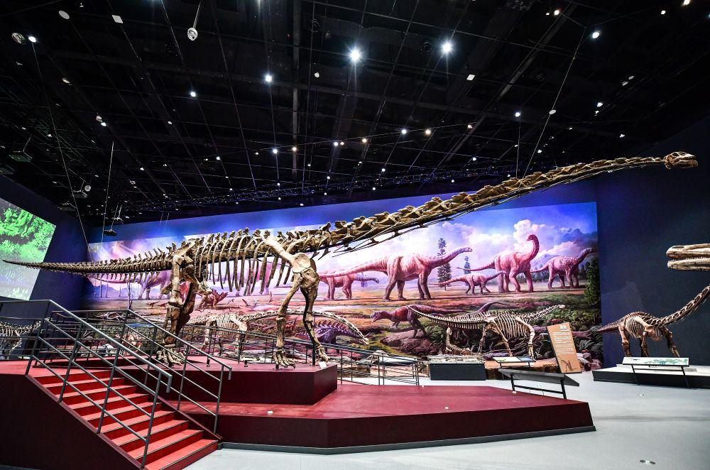 矗立在成都自然博物馆(成都理工大学博物馆)的合川马门溪龙正型标本。(8月12日摄)新华社记者 张超群 摄