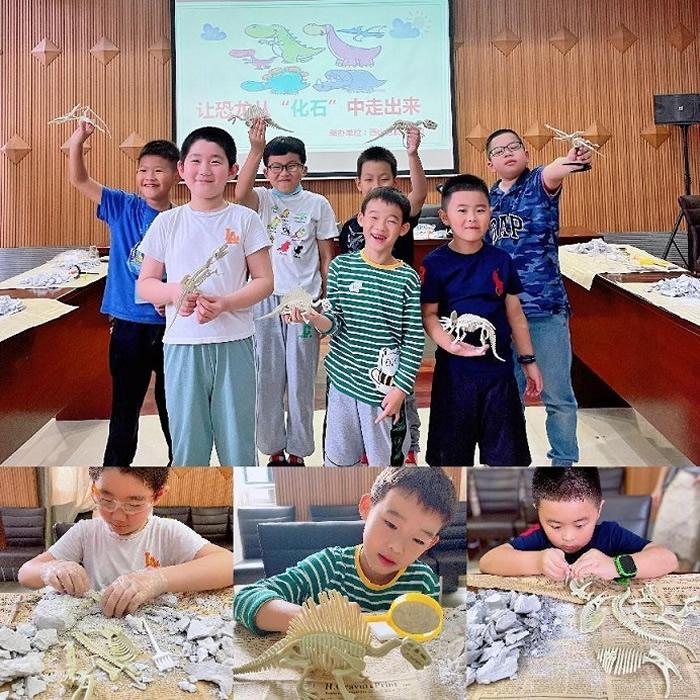 活动现场小朋友们化身为小小考古家,端坐在桌前,首先选择好自己想发掘的“恐龙”,然后手持着小锤子和各种工具敲击化石,将外层的石块一点一点的敲离,取出里面“恐龙骨架”,然后拼装起来。在家长和小朋友的共同努力下,一个个小恐龙就组装完成啦,成型的恐龙骨架精致可爱,各个部位极其逼真,放在展厅里将是一件件引入注目的展品!