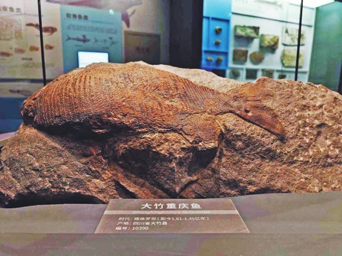 “大竹重庆鱼”位于三楼“生命探源厅”,这一距今1.5亿年前的鱼化石看起来栩栩如生,形态立体且体态丰满,完整程度堪称中国鱼化石之最。鱼的头、胸、尾、鳍、鳞均清晰可见,仿佛穿越时光的长河,“游”到了观众眼前。