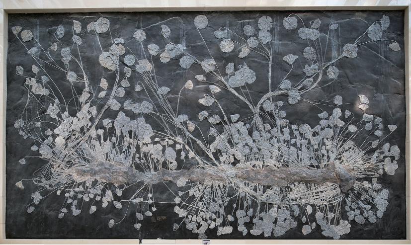 该标本长 10.2 米,宽 5.8 米,是国内本体与寄生木最大、最完整的海百合化石标本。该标本产自贵州关岭距今约 2.2 亿年的晚三叠世地层中,为海百合群体与寄生木共存的化石标本。