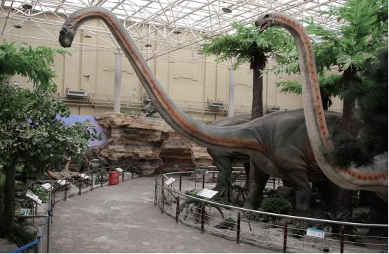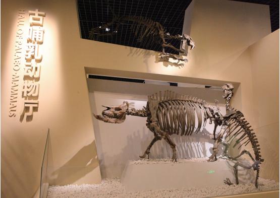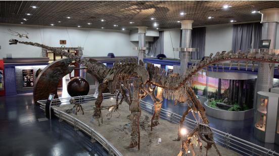 ( 1 )古爬行动物厅。古爬行动物厅向观众展示了生物界 2 亿多年前的景观,并以总鳍鱼、鱼石螈、蚓螈和异齿龙为代表,演示了脊椎动物从水域向陆地发展的复杂过程。大厅中央展示的恐龙骨架群栩栩如生,如中国人发现的第一只恐龙——许氏禄丰龙、体长达 26 米的井研马门溪龙、称王称霸的霸王龙、小巧玲珑的恐爪龙、背上布满剑板的沱江龙、威风凛凛的永川龙、展翅翱翔的翼龙、称霸海洋的鱼龙。