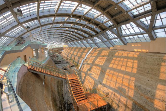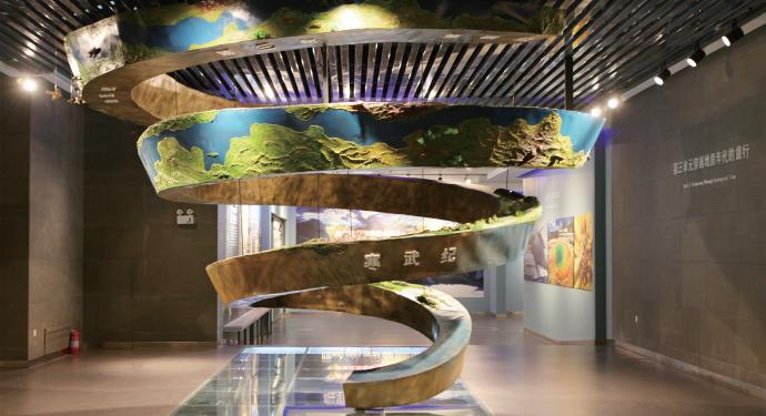 这是世界上最大的室内地层剖面地质长廊,建筑面积 6 700 平方米。观众在栈道自由穿行,置身其间:感受化石发现过程,了解化石成因,探求远古的气候、生态、环境、火山喷发等信息,系统地对断层、褶皱、岩性、埋藏等地学