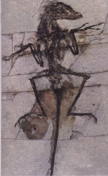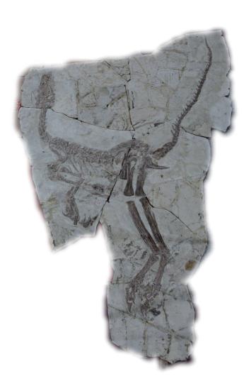 赫氏近鸟龙是一种带羽毛的恐龙,产自辽宁省建昌县的侏罗系髫髻山组,距今约 1.6 亿年。其骨架周围清晰地分布着羽毛印痕,特别是在前、后肢和尾部都分布着奇特的飞羽,这种特征在灭绝物种中尚无先例。