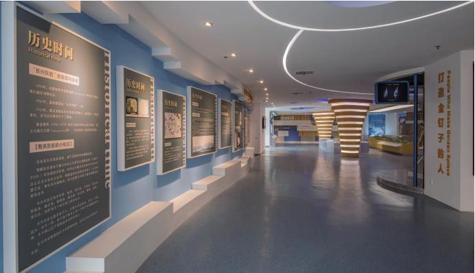 ( 3 )金钉子厅。主要内容为金钉子的由来(什么叫金钉子、金钉子的级别)、金钉子为什么落户长兴煤山(金钉子的重要性、煤山剖面的优势、全球金钉子的现状)、打造金钉子的过程(历史事件、打造金钉子的人、打造金钉子的方法、打造金钉子的成果)、长兴金钉子的意义、金钉子的保护,并有多个视频解说及互动画面。