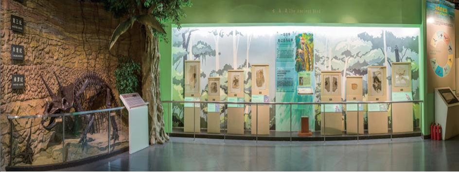 534 件化石标本,展览了许多特色标本,如热河生物群的辽宁古果、林氏星海鸟、镇远翼龙、华夏翼龙、滕氏嘉年华龙、奇异辽宁龙、国章燕鸟、双庙龙、燕都华夏鸟等。