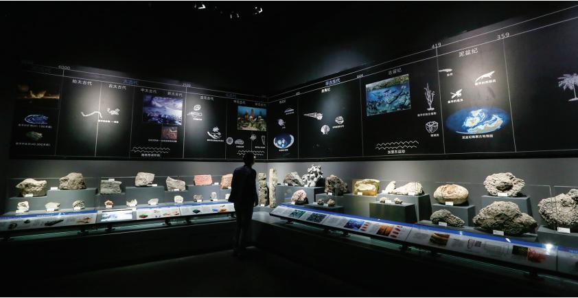( 1 )地球厅。以新地球观为指导,将地球视为活力系统,以全新视觉揭示地球科学研究进展。展品以岩石、矿物、古生物化石标本为主,重点展示地球的圈层结构、地壳运动、内外动力地质作用,以及地质发展史,同时还介绍了“上天”“下海”“入地”等科学前沿内容。