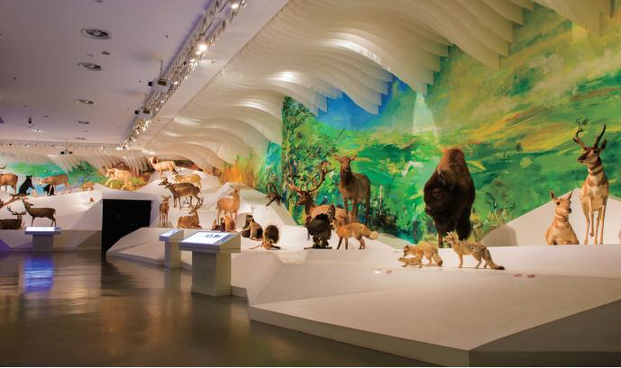 4 )动物厅。以美国慈善家肯尼斯·贝林捐赠的世界各地的野生动物标本为主要展品,充分展示物种和生态系统的多样性,在全球背景下突出野生动物的区域特色。