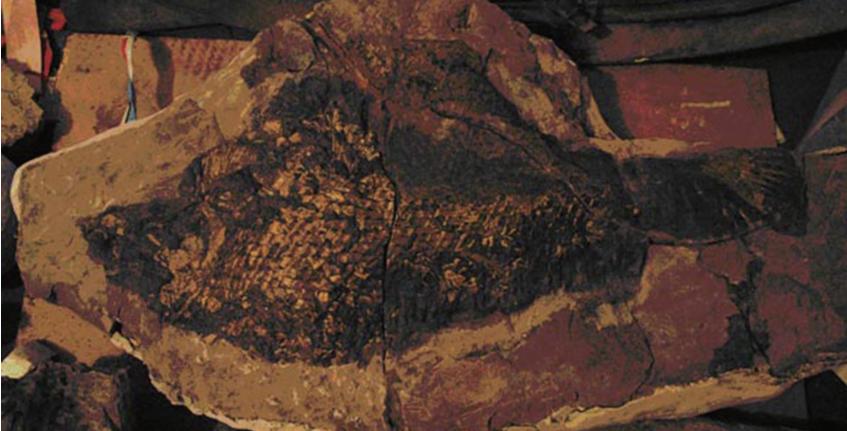 2006 年夏天,发现于綦江北渡中学旁的綦江河左岸边。产出地层为侏罗系遂宁组泥岩,长 70 厘米,宽 43 厘米,鱼鳞清晰,保存完整。属于全骨 鱼类中的鳞齿鱼类,淡水鱼。展出于綦江博物馆。