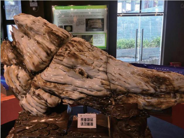 产于缅甸,虫子和树木同时玉化,展出于綦江木化石博物馆。