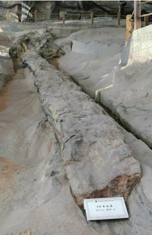 翠屏山 8 #木化石,直径 0.8 米,可见长度 28.9 米,硅化与钙化共生,局部树皮煤化,保存完整,可见树根。在翠屏山木化石原址保护馆保存。