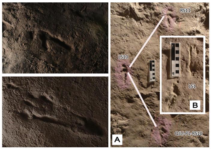 翼 龙 前 足 迹(左上)翼龙后足迹(左下)翼龙行迹(右)