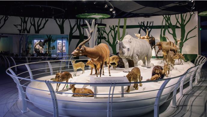 ( 1 )地球厅。以新地球观为指导,将地球视为活力系统,以全新视觉揭示地球科学研究进展。展品以岩石、矿物、古生物化石标本为主,重点展示地球的圈层结构、地壳运动、内外动力地质作用,以及地质发展史,同时还介绍了“上天”“下海”“入地”等科学前沿内容。