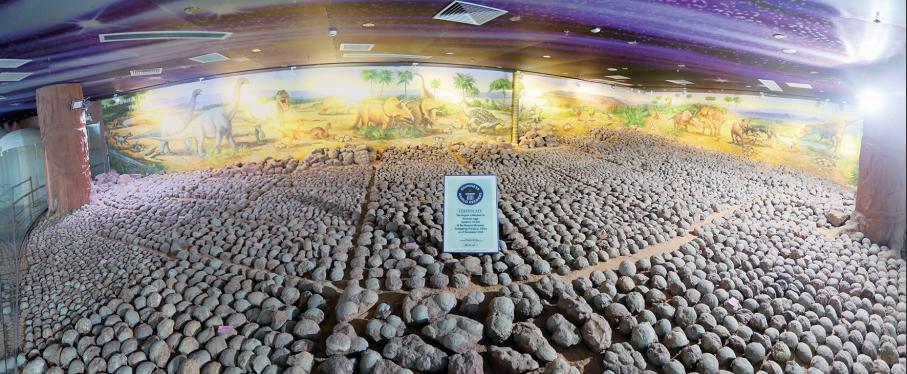 河源恐龙蛋化石最早发现于 1971 年。1996 年 3 月后大规模涌现,目 前馆藏恐龙蛋化石18 000多枚,为世界之最。这些恐龙蛋大多为圆形或扁 圆形,还有长条形、棱柱形,规格从直径 1.5厘米至 23厘米不等,尤其珍贵 的是晶体恐龙蛋化石,内含萤矿物质,晶莹剔透。