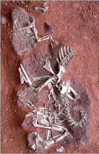 黄氏河源龙骨骼化石最早发现于 1997年 7月。中国地质科学院地质 研究所吕君昌博士通过多年的修复 和研究,于 2002 年 12 月在美国著名 杂志《脊椎动物古生物学》(JVP)上 发表的《记中国南方晚白垩世一新的 窃蛋龙》一文中,正式将河源地区出 土的 9具恐龙化石命名为“黄氏河源 龙”。黄氏河源龙为窃蛋龙科新属新 种,骨骼化石的时代为距今 6 600 万 年的白垩纪晚期,身长 2—3米,体重 约 100 千克,头颅骨缺乏牙齿,口鼻 部短而高挺。它的手臂及手指很短, 拇指已经退化,善于捕猎蜥蜴、小型 哺乳动物。黄氏河源龙是一个既保 留了小型兽脚类恐龙的一些特征,又 具有鸟类的一些基本特征的新品种,是恐龙向鸟类演化的中间生物。它的 发现不但进一步提供了窃蛋龙类发现于内蒙古戈壁滩之外的首次确凿证 据,而且还为窃蛋龙的鸟类地位提供了标本证据。