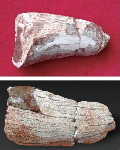 霸王龙类牙齿化石发现于 2007 年。现保存的牙齿长约 7.6 厘米。牙 齿齿尖、齿根及大部分边缘锯齿均缺失。牙齿保存部分稍弯曲,釉质非常 薄,釉质脱落后暴露出的牙齿部分显示出明显的纵向条纹。牙本质具有明 显的分层现象。霸王龙是一种凶猛的食肉恐龙,也是迄今已知最大的、已灭绝的陆生食肉动物。其 头骨笨重、粗大,有的长度 超过 1 米;体长可达 13 米, 体重可达 6 吨以上;牙齿锋 利具有锯齿,长度可达 18 厘米;颈部短粗,身躯结实, 后肢相对细长,前肢退化, 细弱,特小,仅存二指;两足 行走,以捕食植食性爬行动 物为生。霸王龙类牙齿化 石的发现,表明河源地区曾 经有过大型肉食恐龙活动, 为深入研究河源地区的古 生物状况,特别是对探究恐 龙的习性、种类繁衍行为和方式、演化情况有着重要的科学价值。