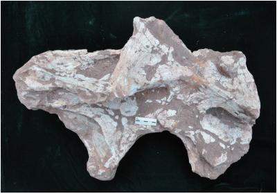 蜥脚类恐龙颈椎化石发现于 2004 年 2 月。化石呈乳白色,长约 65厘米,宽约50厘米,是蜥脚类恐龙中的巨龙类颈椎化石。从脊椎骨的大 小推断,这只巨龙的体长为 17—18 米,体重达 20 —30 吨。蜥脚类恐龙是 所有陆生脊椎动物中最巨大的。其头部很小,颈部和尾部很长,四肢粗壮, 以四足行走,以植物为食, 主要生活于沼泽地带。它 们繁盛于侏罗纪,至白垩纪 中期灭绝。蜥脚类恐龙化 石的发现表明,白垩纪,河 源地区的气候十分适合恐 龙生活,有种类丰富的恐龙 在这里繁衍生息。