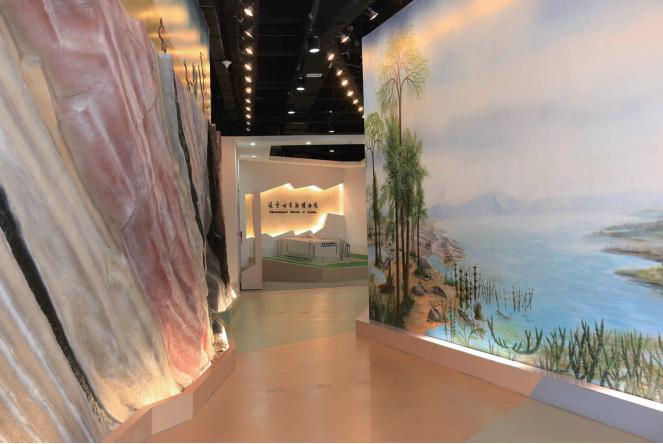 是全馆展览的序厅,包括辽宁古生物化石分布、辽宁省古生物化石保 护、四大明星化石、在辽宁工作过的主要古生物专家等。另外有长达几十 米的地质长廊(长廊两侧是距今 30亿年的辽宁地层剖面和当时的生态环 境复原图)、博物馆外形设计建筑模型等。
