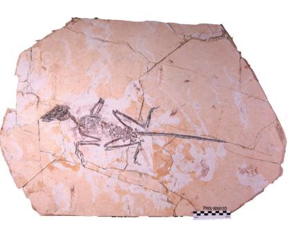是生活在距今约 1.25 亿年的辽西热河生物群的一种会滑翔的蜥蜴。 它的形体小巧,体长约 15 厘米,身体两侧有8根加长 的肋骨以支撑皮肤翼膜, 既能在树林中攀爬,也能 在空中滑行。是迄今发现 的唯一的早白垩世会滑翔 的蜥蜴化石。它与生活在 东南亚和我国南方的飞蜥 非常相似。赵氏翔龙的发 现,填补了滑翔行为在蜥蜴演化史上的空白,对热河生物群的热带或亚热 带气候环境也有了很好的指示作用。