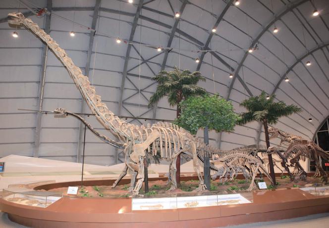 是气势雄伟的辽宁大型恐龙厅,9件产自辽宁的大型恐龙首次集体亮 相,其中长达 15米的辽宁巨龙是辽宁古生物博物馆和沈阳师范大学古生 物研究所首次联合发掘和研究的成果。