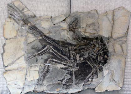 为距今约 1.25亿年的辽西热河生物群中的一种小型驰龙类肉食性恐 龙。因前后肢都发育有长长的不对称的飞羽,小盗龙又被誉为“四翼恐 龙”。前后肢不对称飞羽的出现,表明了羽毛在非鸟兽脚类恐龙中已经演 化出非常复杂的结构,而且这些飞羽已具有了一定的适用于飞行的特征, 它就是靠张开像两对翅膀一样的四肢在树林之间滑翔的;同时,也首次显 示了在早期鸟类飞行的起 源演化过程中,曾经历了一 个“四翼阶段”。此外,它的 第一趾位置低且所有趾爪 钩的曲度较大,揭示了小盗 龙可能是树栖生活,为飞行 的“树栖起源”假说提供了 证据。小盗龙的尾巴末端 是菱形的尾扇,上面长有尾 羽,有可能用于在飞行过程中保持平衡。然而它的后肢上长长的羽毛有碍 于奔跑行走,因此小盗龙一般只待在树上。