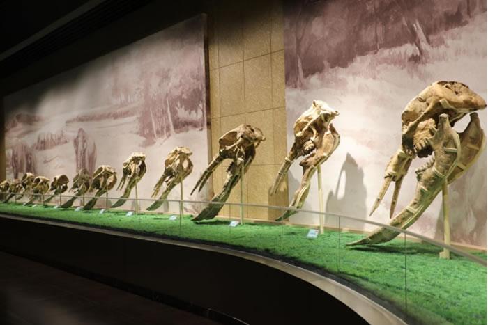在这座“动物园”里穿行,记者看到大大小小的古动物化石静静地陈列着。其中,有许多完整的动物骨架化石镶嵌在泥土中,被整块发掘出来,定格着古动物们生前最后的姿势。在铲齿象化石展厅,24具从三四个月到40多岁的铲齿象头骨化石依次排列,从中仿佛能看到这种史前巨兽一生的轨迹。
