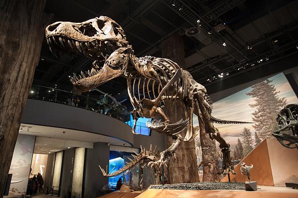 一楼展示了霸王龙的全身骨架复原,恐龙馆一楼展厅以时代为主线,用化石标本、全身骨架复原、复原模型和多媒体等手段介绍三叠纪、侏罗纪和白垩纪各时代最具代表性的恐龙。二楼是复原模型,介绍恐龙的生理,以及与恐龙生活在同时代的海洋和空中霸主。