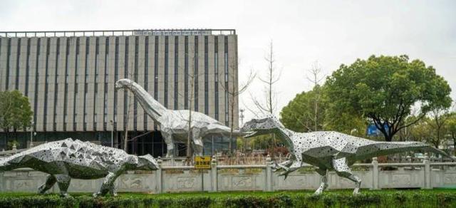 在博物馆外围,有三只不锈钢雕塑的恐龙引人入胜。还有一排大石头,这是馆外陈列的标本廊,其中有一块超镁铁质球状岩是馆内的镇馆之宝之一,这是展示浙江形成于约8.4亿年前的物品,系全球唯一实属罕见的地质珍品,是研究浙江大地构造演化的重要载体。