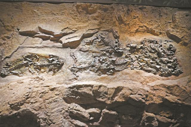 驻足在巨大的化石模型前,观众仿佛穿越了2亿多年的时空。9头小兽有的平行而卧,有的依偎在一起,生命的最后瞬间被生动定格。由于没有经过地质搬运,化石中保存了很完整的信息,极为珍贵。