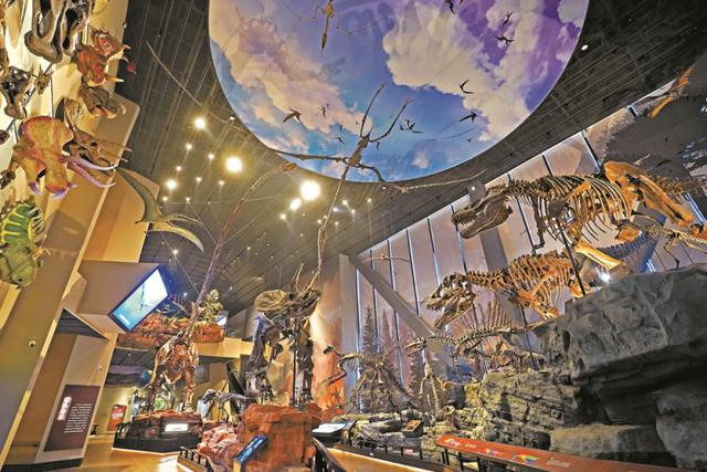 沧龙和一群翼龙化石模型悬吊在空中,迎接着游客的到来;脖子最长的恐龙——体长超过35米的中加马门溪龙,傲然挺立在队伍前列;“中华第一龙”许氏禄丰龙,则是中国人自主发现、发掘、研究、装架并展出的第一条恐龙……在“恐龙帝国”展厅中,化石骨架模型复原出的“恐龙军团”气势恢宏。