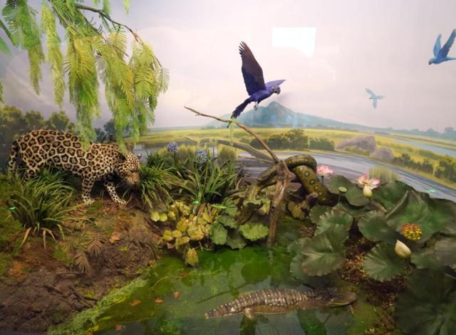 初春的东北,积雪还未消融,一只东北虎静静地潜伏在林中,等待马鹿走进它设下的陷阱;雨林中,树梢结满了无花果,吸引了一只带着幼崽的红毛猩猩前来觅食,在枝头与它一起用餐的还有一只盔犀鸟;美洲豹正在湿地旁静候时机,准备狩猎凯门鳄,而蓝紫金刚鹦鹉发现了危机,振翅飞向空中……这些栩栩如生的场景,是中国古动物馆专门打造的复原景箱。