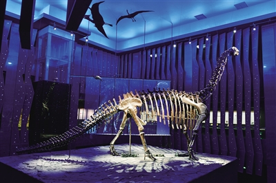 在内蒙古博物院远古世界展厅的中央天井中,陈列着该院的镇馆之宝——查干诺尔龙骨架。它脚下是高逾6米、面积约150平方米的巨型台座,顶棚是巨幅喷涂的蓝天白云背景,空中悬挂着4件翼龙复原雕塑模型,与天井四周的展示项目遥相呼应。进入该展区的观众,无不被查干诺尔龙庞大的骨架震撼,于是,这里便成为博物院最聚人气的拍照留念区。